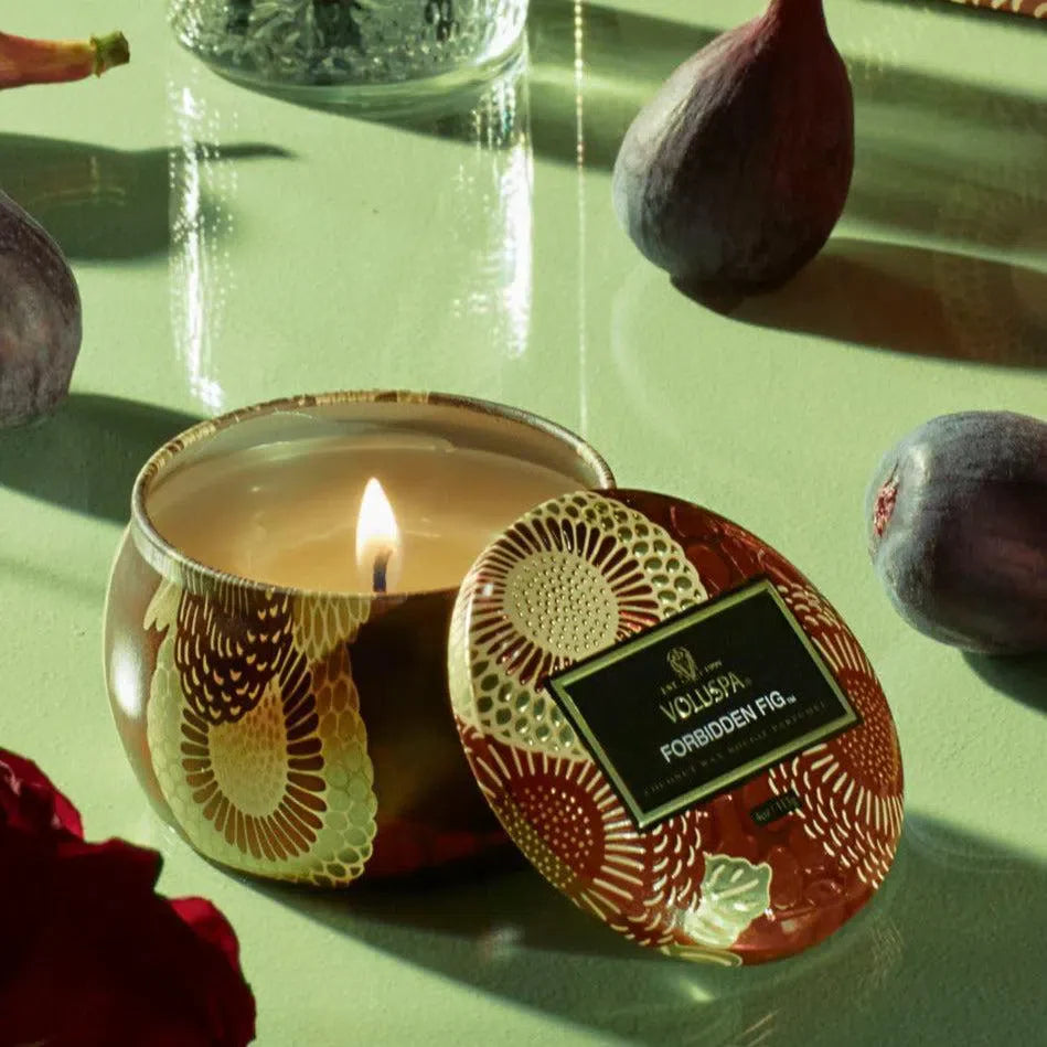 A exclusiva mistura de cera de coco da Voluspa é despejada à mão em um recipiente de metal adornado com um padrão de Jarponico e é coberta por uma tampa combinando que mantém a vela livre de poeira quando não está em uso. O pavio único permite que você desfrute da fragrância por 25 horas. As velas são despejadas à mão nos Estados Unidos e apresentam a mistura de cera de coco proprietária e pavios 100% naturais, que queimam de forma limpa. Os produtos são livres de ftalatos, pesticidas, parabenos e sulfatos, e nunca são testados em animais. Dê um novo propósito a lata transformando-a em uma lembrança após a última queima.