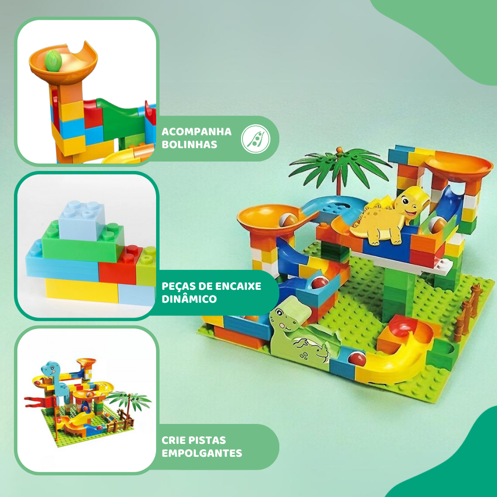 Dino Track Maze 130pcs é um conjunto completo para montar pistas emocionantes para bolinhas, com peças temáticas de dinossauros que tornam a brincadeira ainda mais divertida. Estimula a criatividade, a coordenação motora e o pensamento lógico das crianças durante a construção e o uso das pistas.