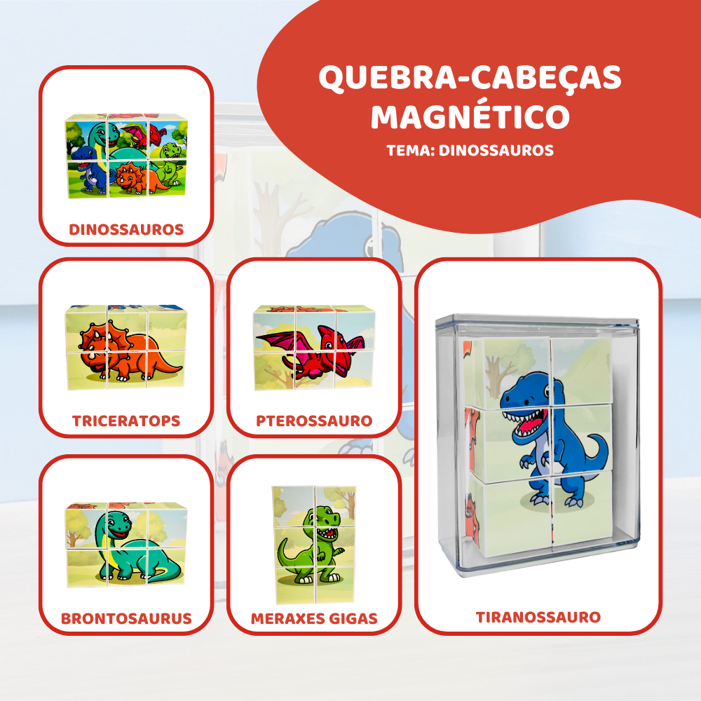 MagForma Mega Cubos Puzzle Dinossauro 6 peças é uma aventura jurássica que une aprendizado e diversão! Com peças magnéticas grandes e resistentes, as crianças podem montar diferentes dinossauros combinando cores, formas e expressões. Além de entreter, o brinquedo estimula a coordenação motora, a percepção visual, a criatividade e o interesse pela ciência e pela natureza. Perfeito para pequenos exploradores curiosos e apaixonados por dinossauros!